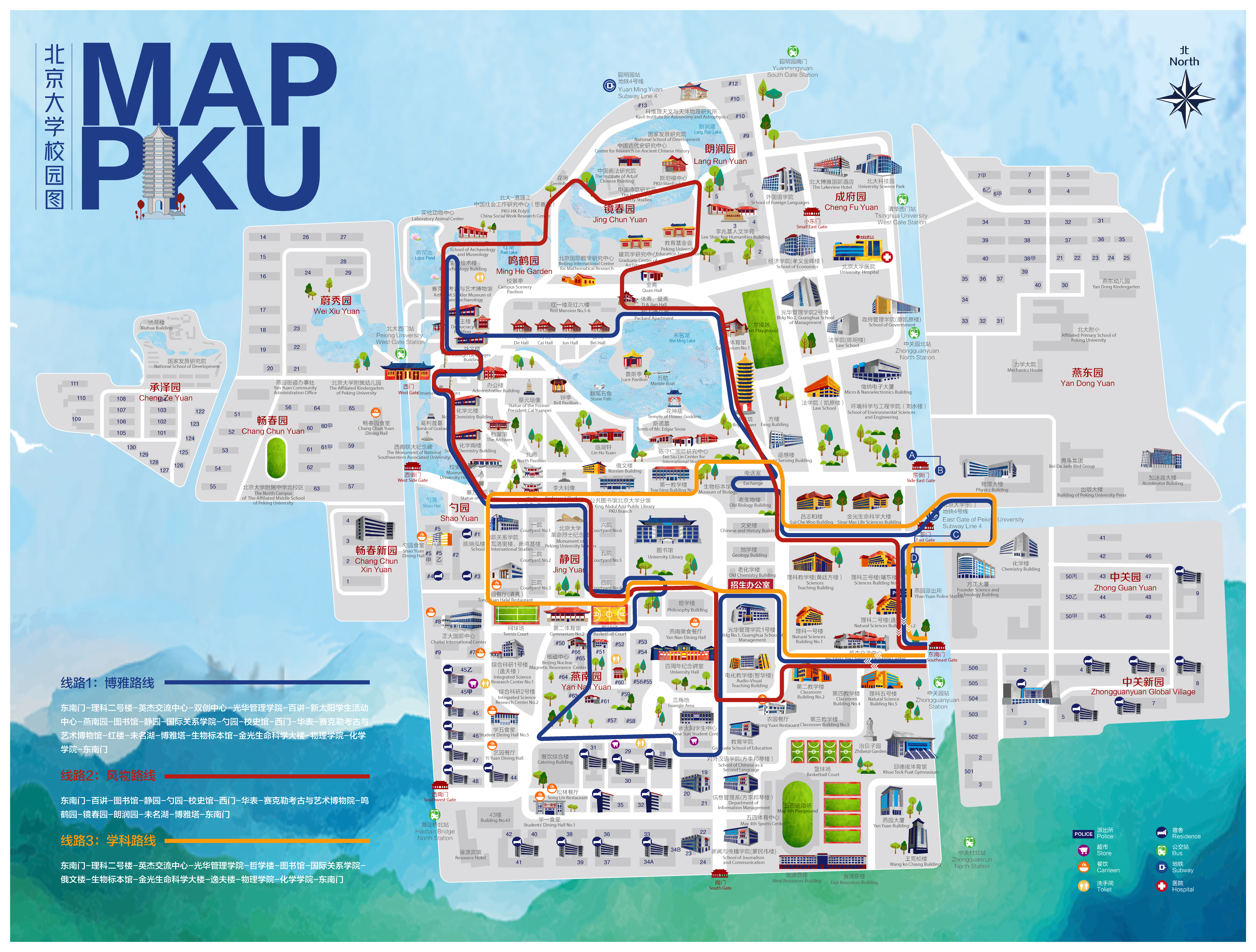 在化学学院,物理学院,生命科学学院,光华管理学院,国际关系学院领略北京大学致力学术,守正创新的情怀,在新太阳学生活动中心看北大学生的风采,于双创中心,英杰交流中心感受北大人面向世界引领未来的姿态,游览间更可以在静园草坪,在未名湖畔小憩,在线路1中定义自己的北大体验。