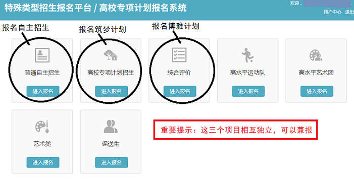 答:自主招生、博雅计划、筑梦计划使用的报名平台为同一个,使用同一个账号: